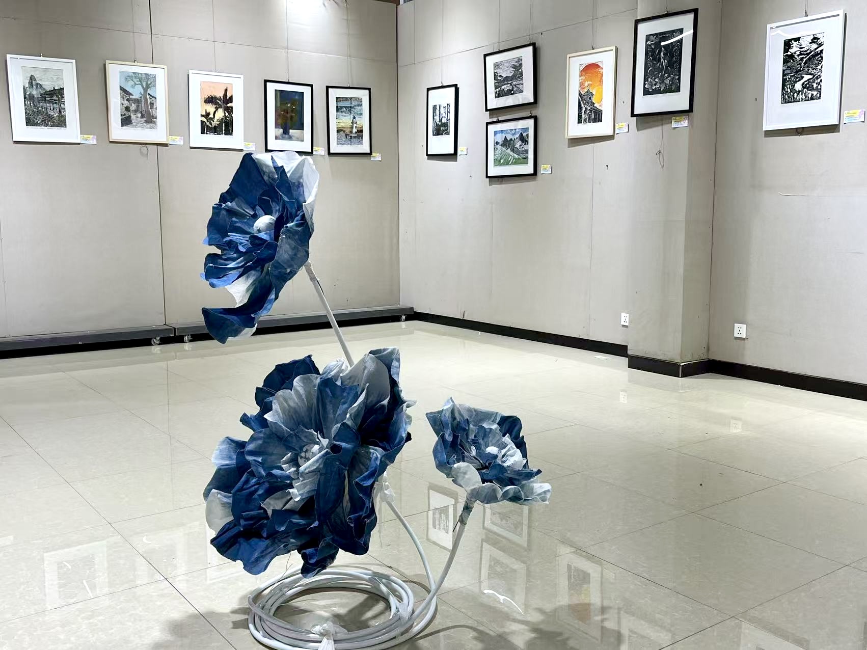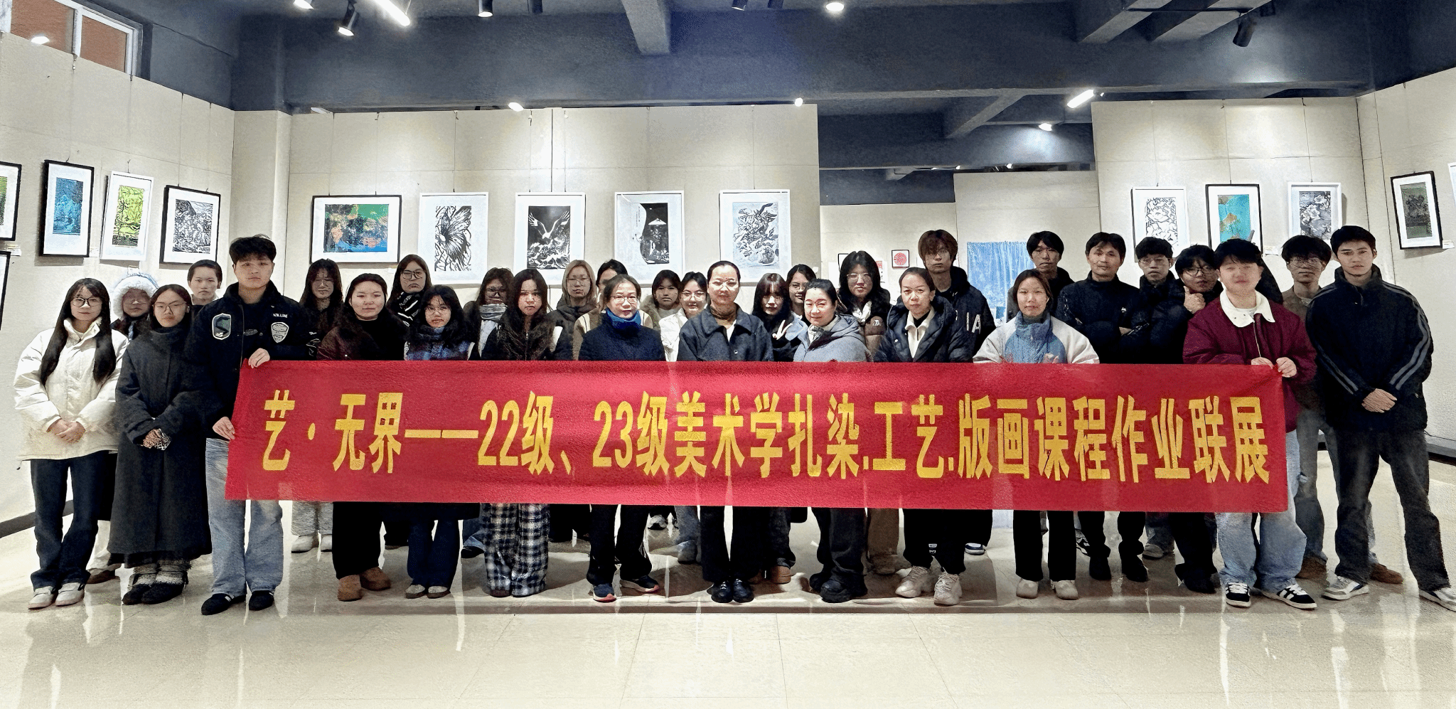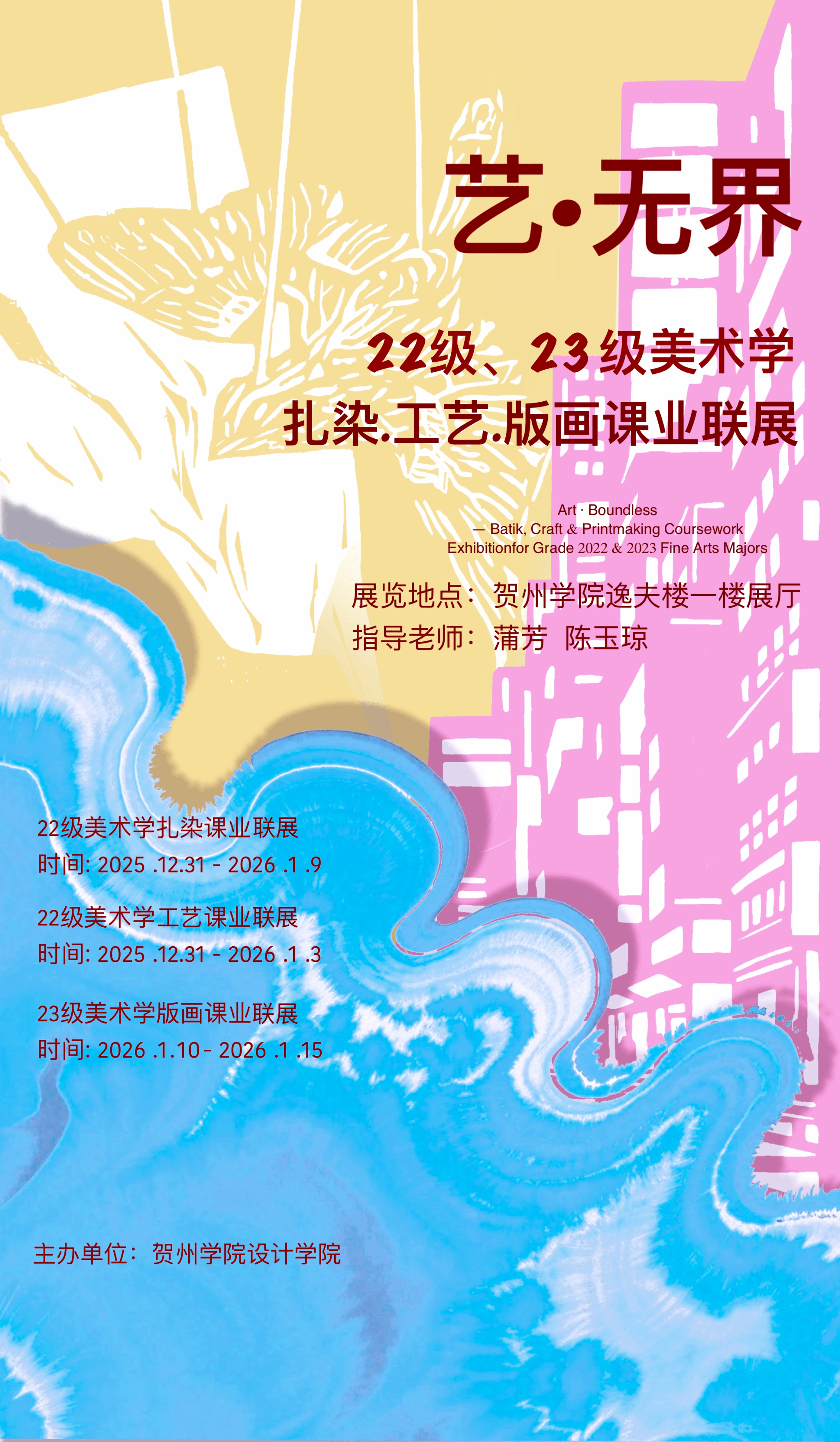 2025年12月31日,贺州学院设计学院美术系主办的“艺·无界——2022级、2023级美术学扎染·工艺·版画课业联展”在逸夫楼一楼展厅开幕。展览由蒲芳、陈玉琼老师指导,集中呈现扎染、纸艺与版画三个方向的课程成果,展期持续至2026年1月15日。