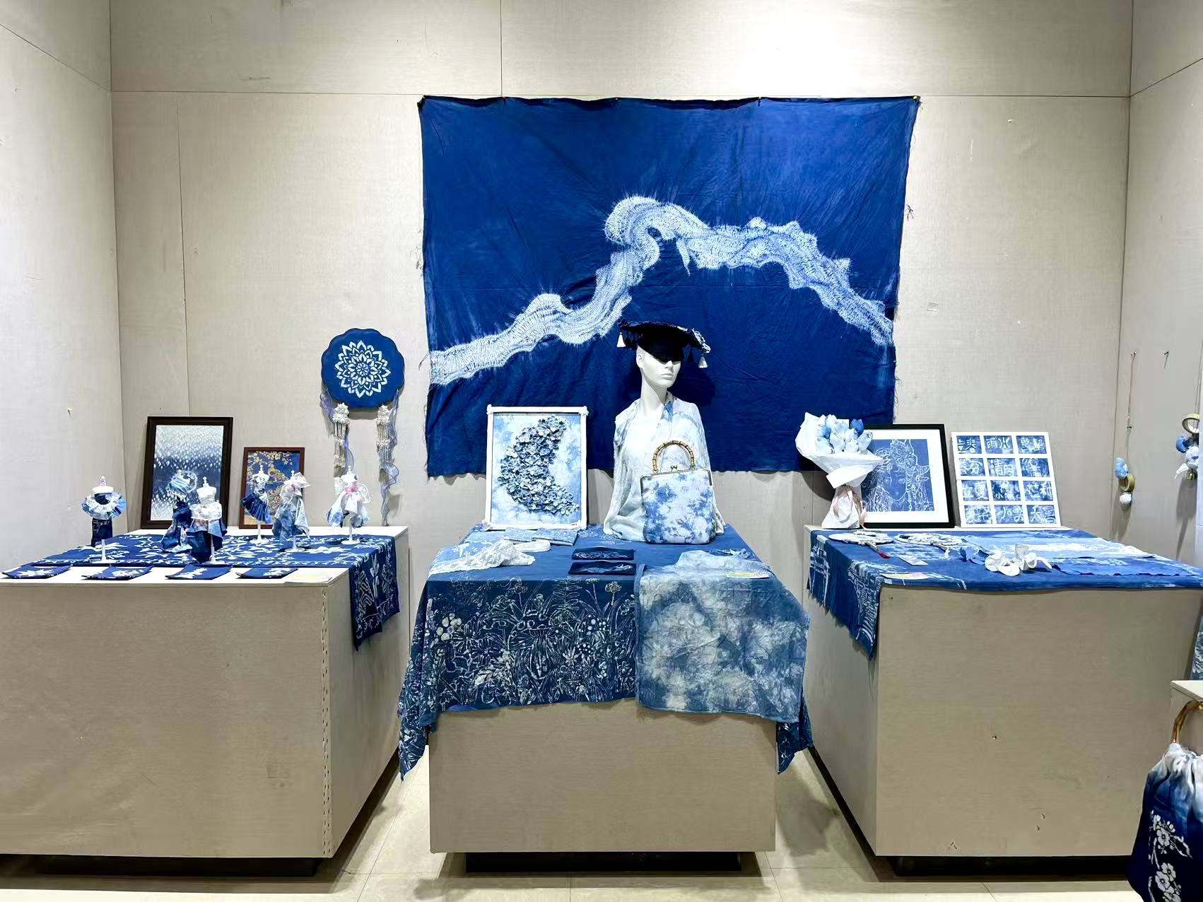 本次联展分为三个板块:22级扎染课业展结合传统工艺与现代审美,通过蓝白纹理与多样图案,展现学生对色彩与肌理的理解;22级手工课业展以纸艺为主,探索非遗材料的制作技艺与实践可能;23级版画课业展突出刀刻与印绘的语言魅力,呈现版画独特的艺术表现。