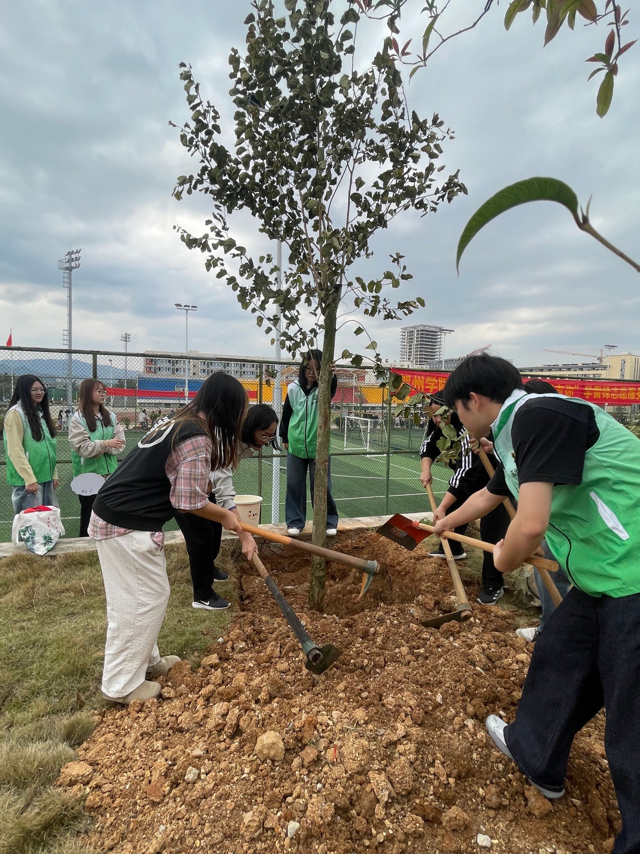 活动现场春意盎然、秩序井然。师生们分工协作、默契配合,挥锹挖坑、扶苗扶正、填土压实、提桶浇水,每一道工序都认真细致、一丝不苟。大家热情高涨、干劲十足,忙碌的身影与嫩绿的树苗相映成景,构成一幅生动的劳动育人画卷。