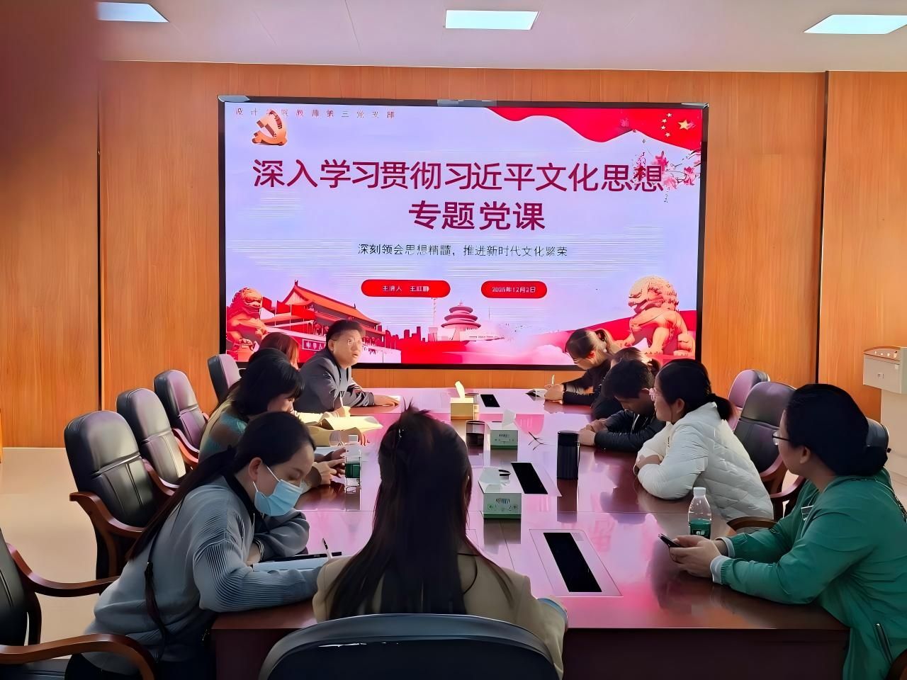 2025年12月2日,设计学院教师第三党支部开展《深入学习贯彻习近平文化思想》专题党课,主题为“深刻领会思想精髓,推进新时代文化繁荣”。党课由王红静副院长主讲,支部全体党员参加。