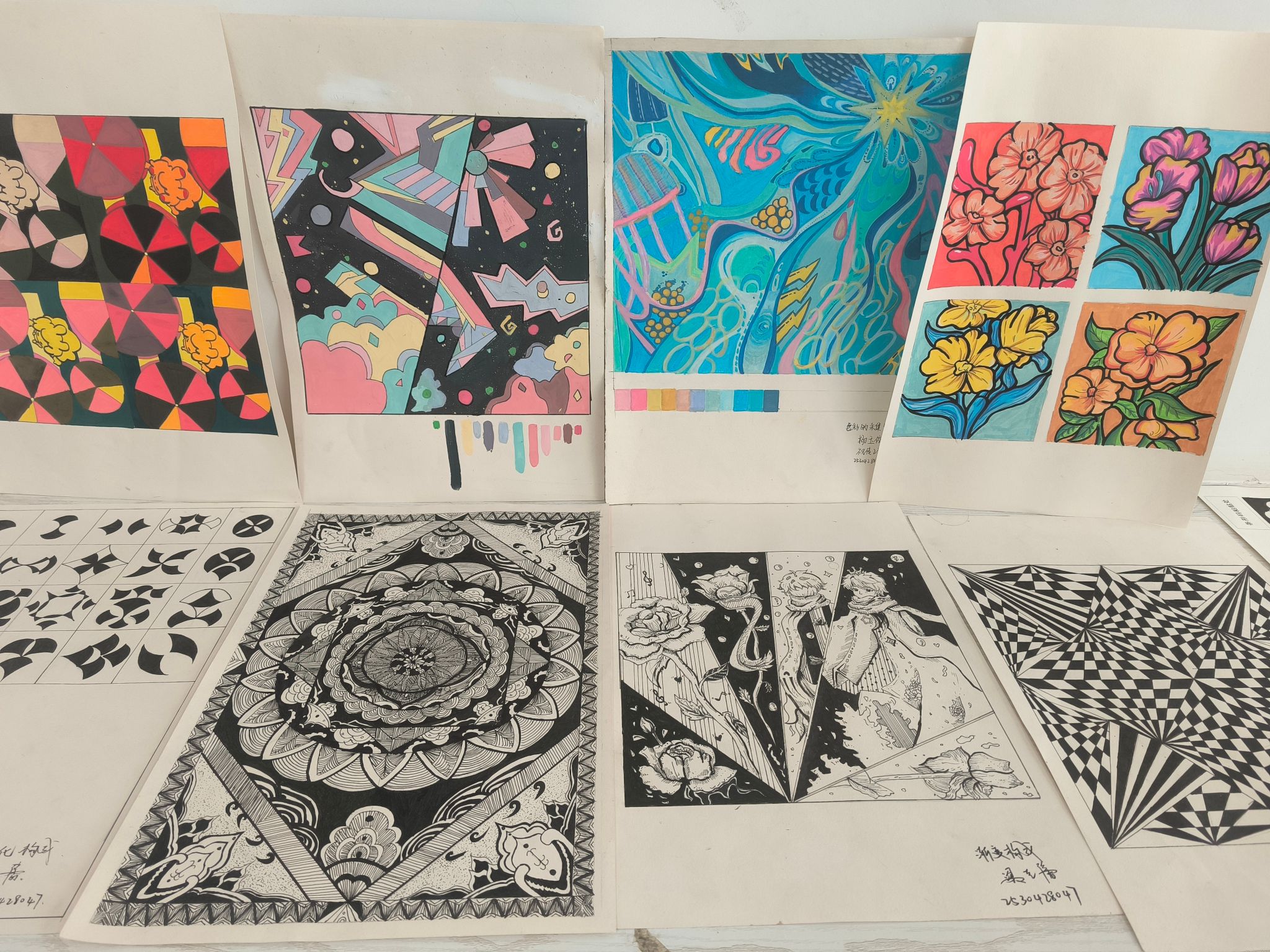展出作品涵盖色彩构成、平面构、民族元素设计等多个类别,全方位展现了学生们扎实的设计功底与无限的创作潜能。在色彩构成作品中,学生们以灵动的笔触、丰富的配色,将冷暖对比、色彩调和等理论知识融入创作,无论是抽象的色彩韵律,还是具象的风景描摹,都彰显着对色彩美学的深刻理解;平面构成作品里,点、线、面的巧妙组合,黑白灰的层次变化,将重复、渐变、发射等构成法则演绎得淋漓尽致,展现出严谨的逻辑思维与设计美感;更有融入民族元素的特色手作,精致的民族风帽子以银饰、刺绣、羽毛为装饰,将传统民族文化与现代设计审美完美融合,成为展览中亮眼的风景线。